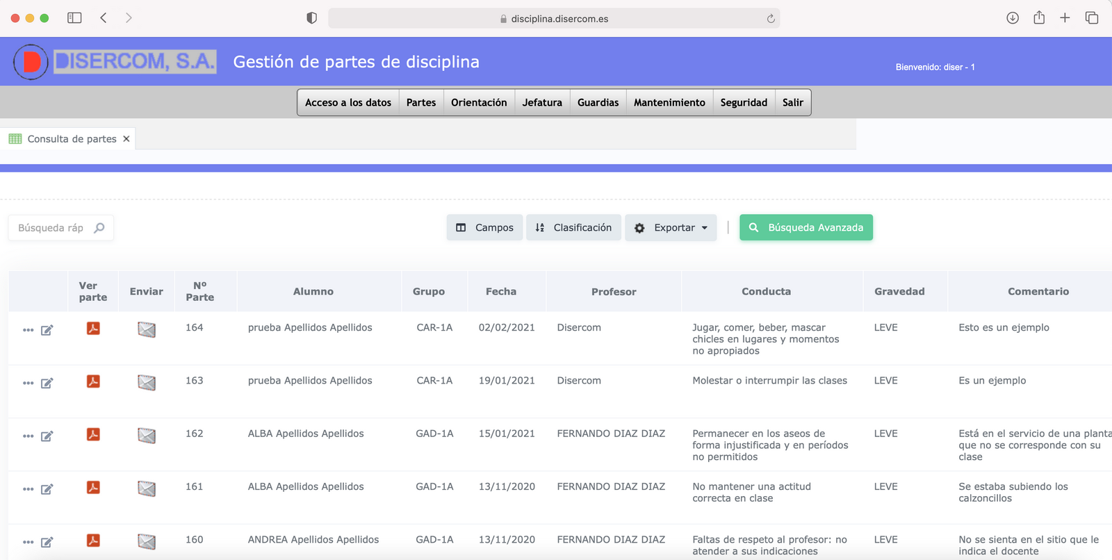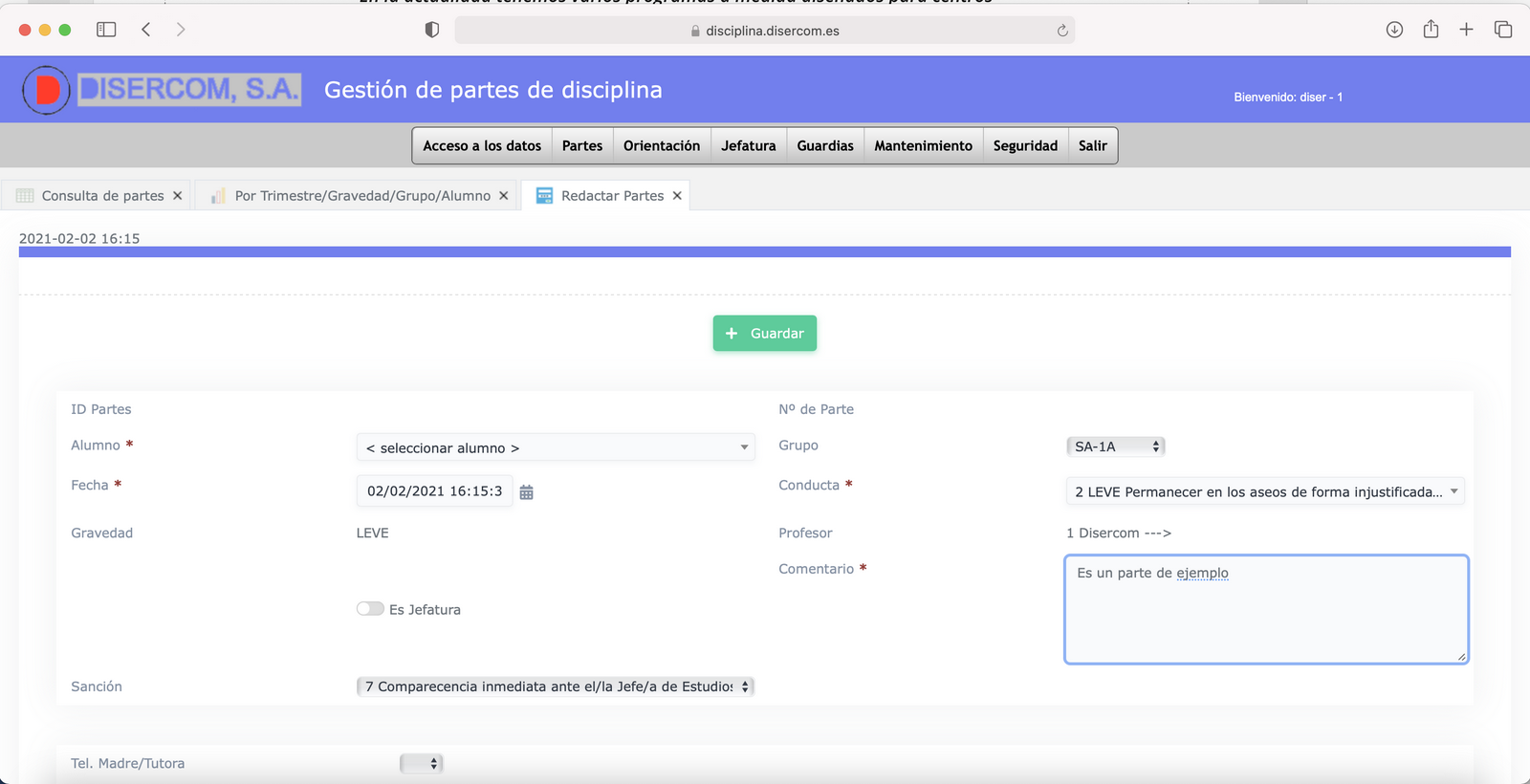 De forma muy intuitiva cada profesor puede redactar partes de disciplina y consultar los mismos.
